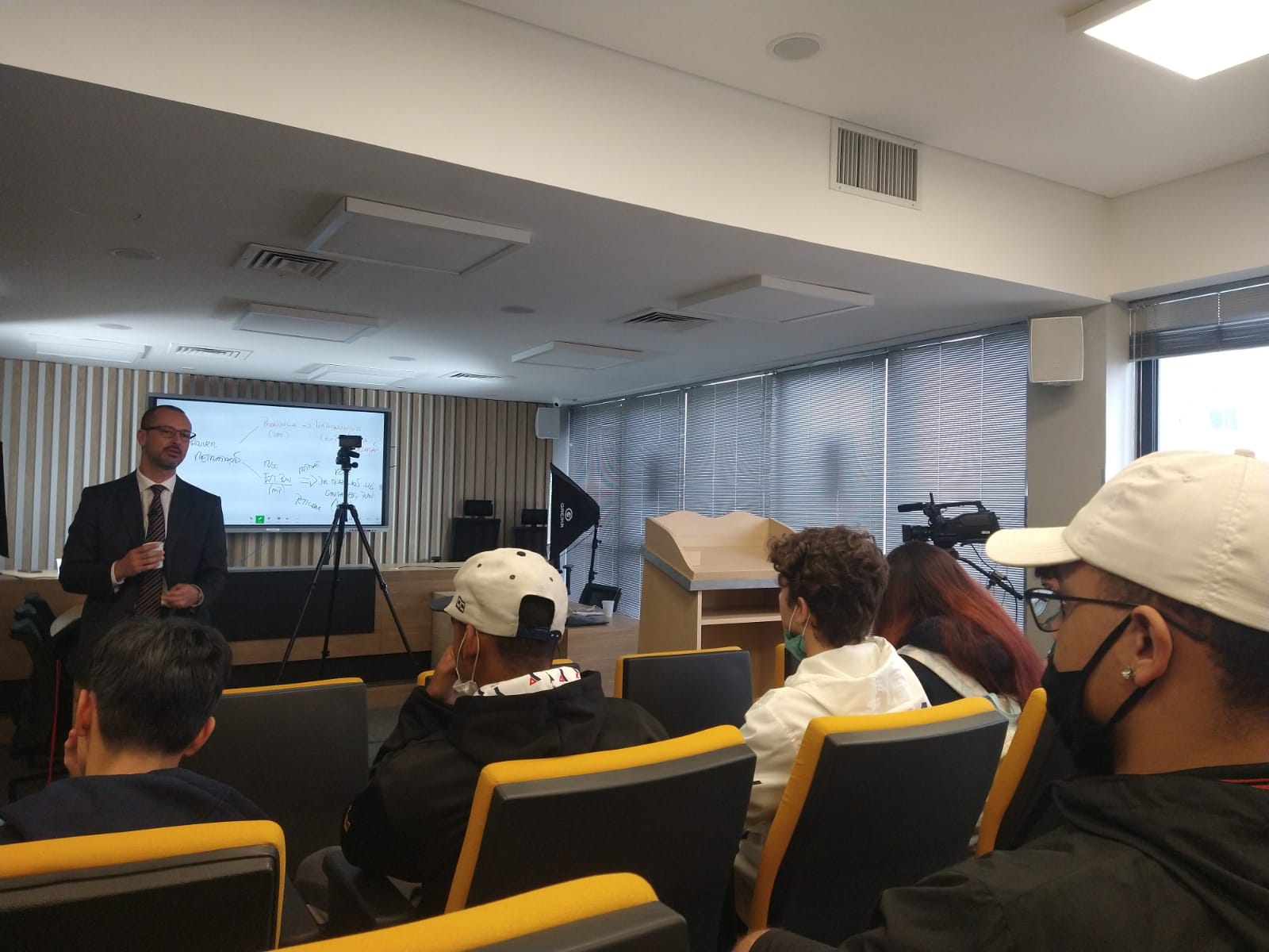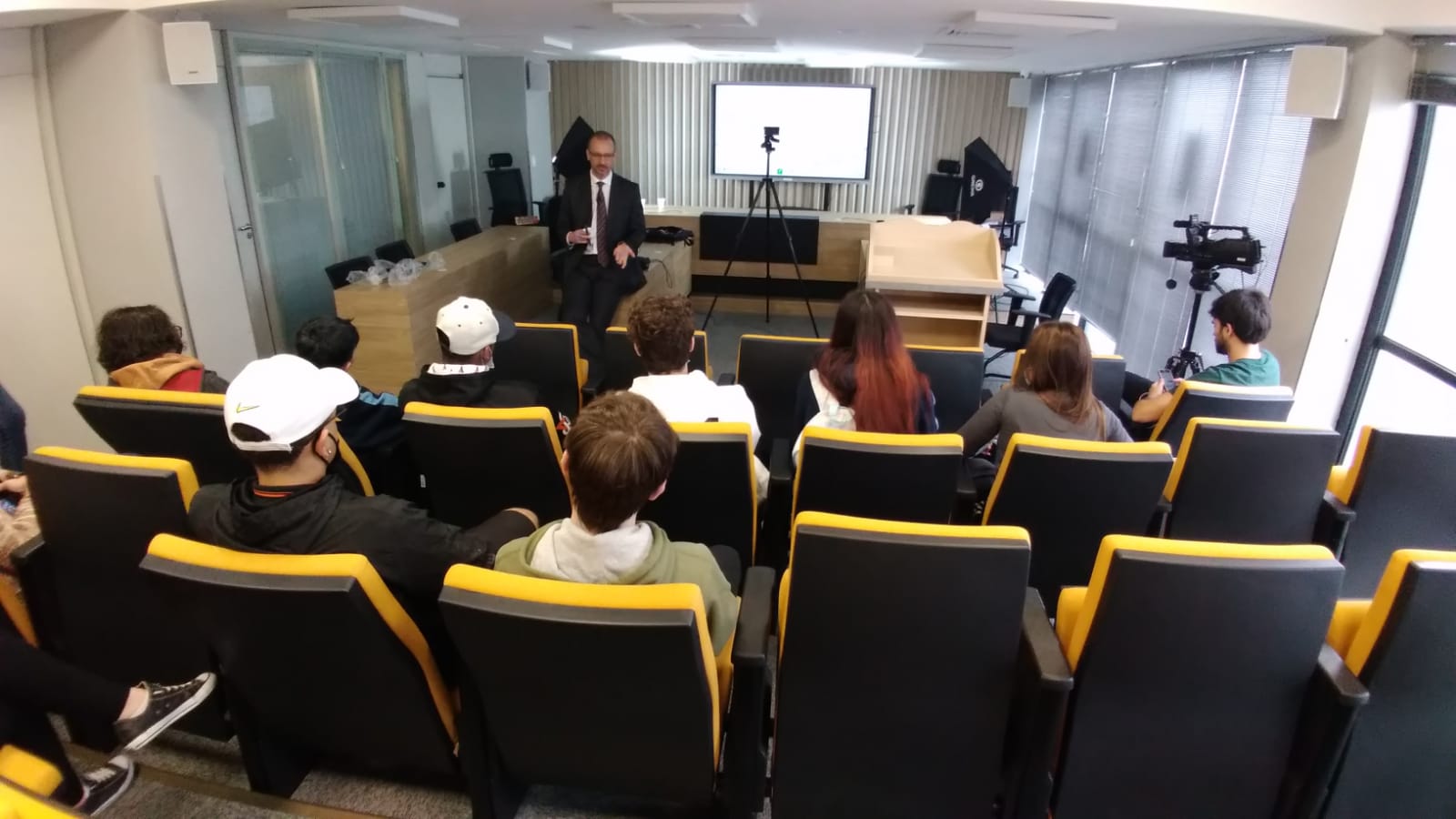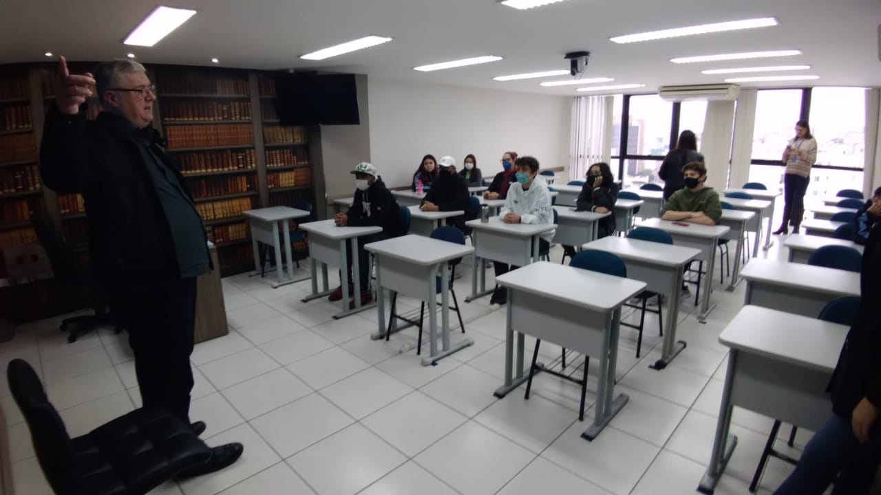 No Tribunal Didático, o Professor Rodrigo Brandalise fez questão de parar a aula que gravava para contar sua trajetória e inspirar os alunos. A visita terminou no décimo primeiro andar onde a turma lanchou e recebeu um presente.