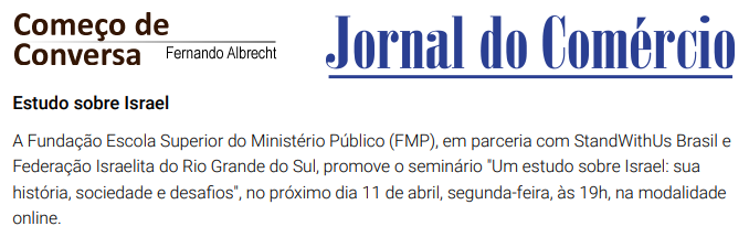 O seminário online “Um Estudo sobre Israel”, que ocorre no próximo dia 11/04, ganhou destaque na coluna Começo de Conversa, do jornalista Fernando Albrecht, no Jornal do Comércio dessa terça-feira (05/04).